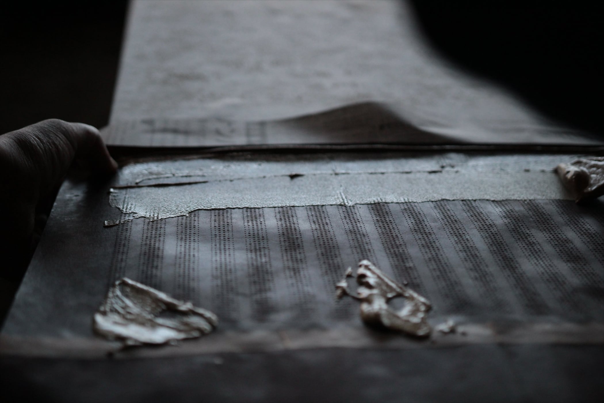 米ぬかともち米から作られた糊を、和紙と柿渋で作られ彫師により精巧に彫られた型紙の上から塗っていきます。