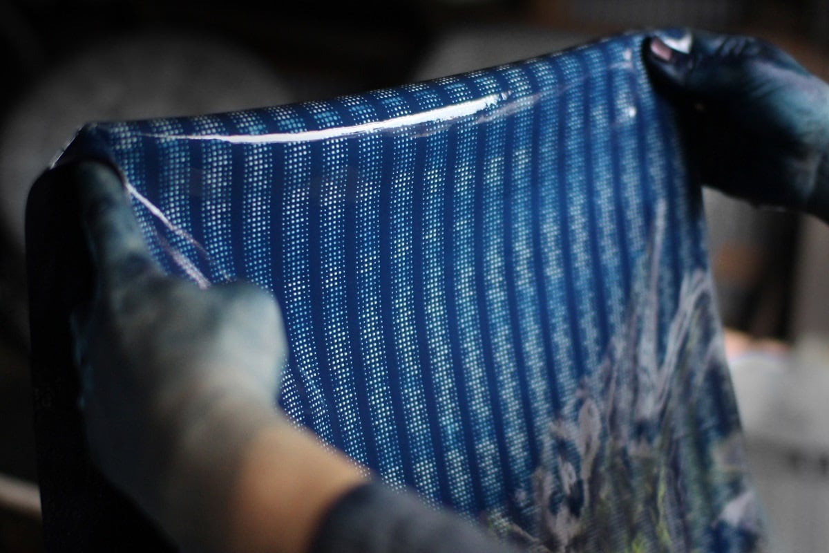 糊は防染の役割をし藍染めにより柄が現れてきます。