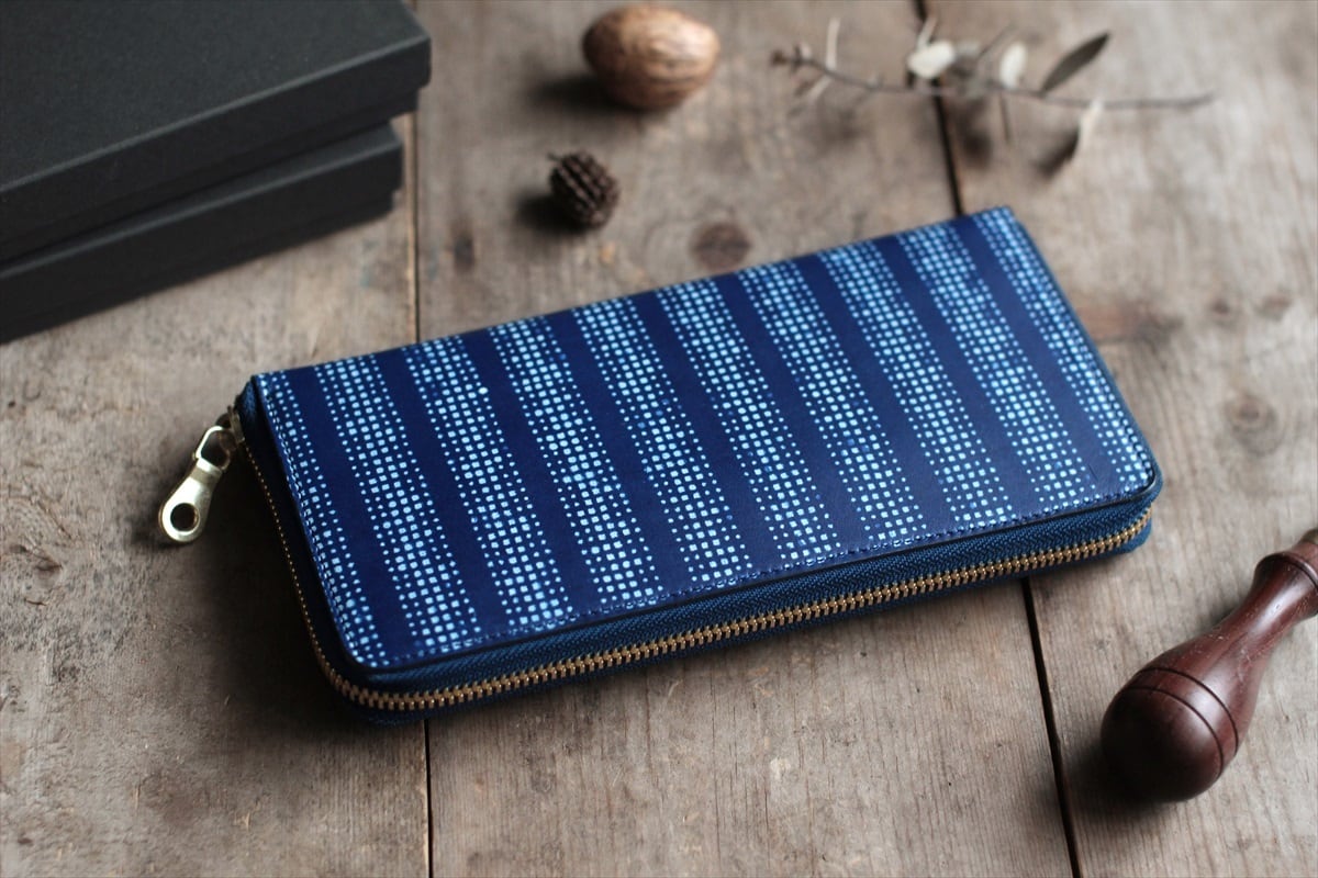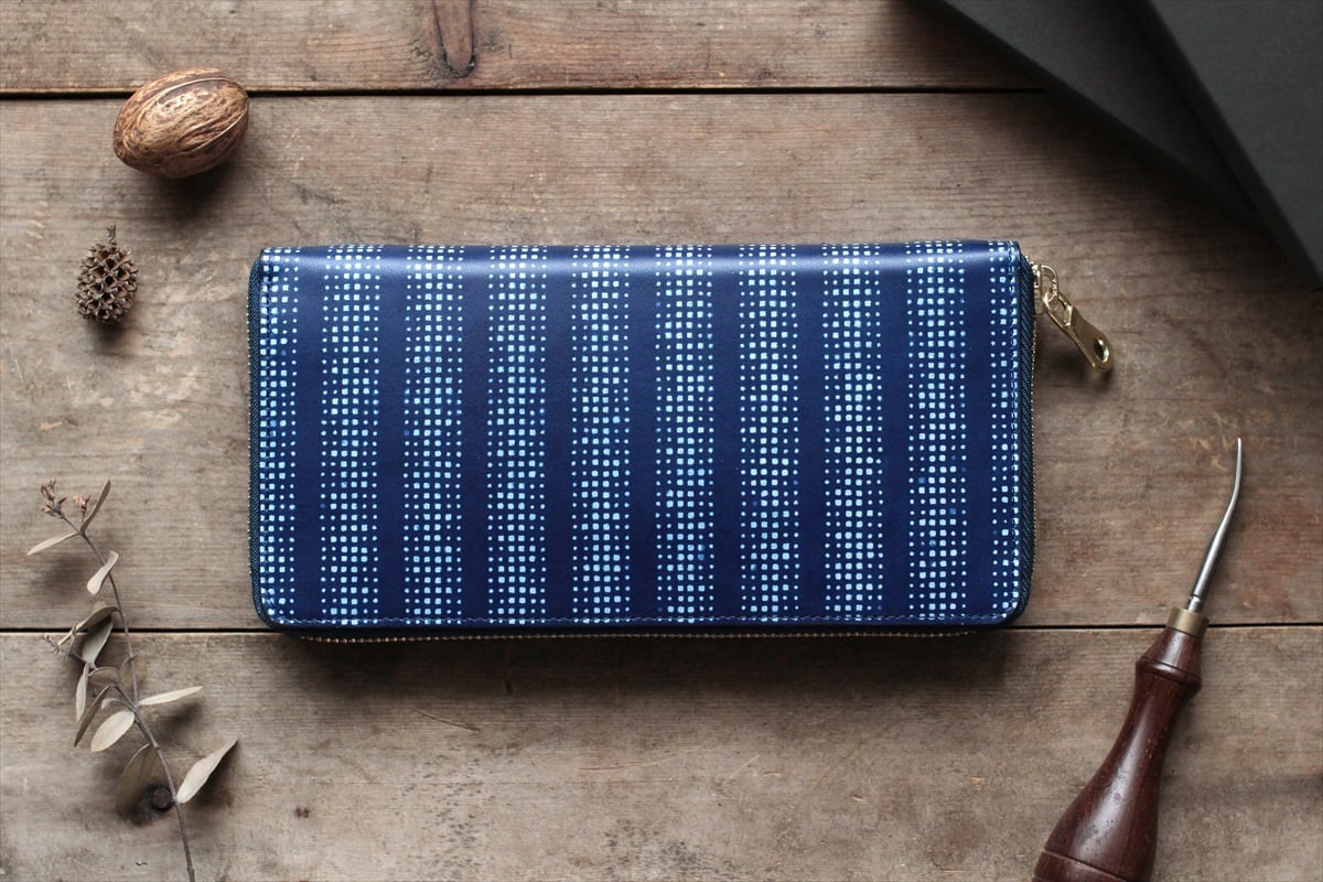 藍染革[migaki] ラウンドファスナー長財布【江戸小紋・円角(enkaku)】