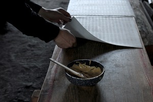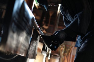 米ぬかともち米から作られた糊を、和紙と柿渋で作られ彫師により精巧に彫られた型紙の上から塗っていきます。
