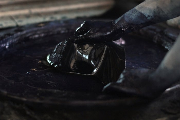藍を建てるところから始め、染めては乾かしを繰り返してゆっくりと深い藍色になる様に染め上げた藍染革。